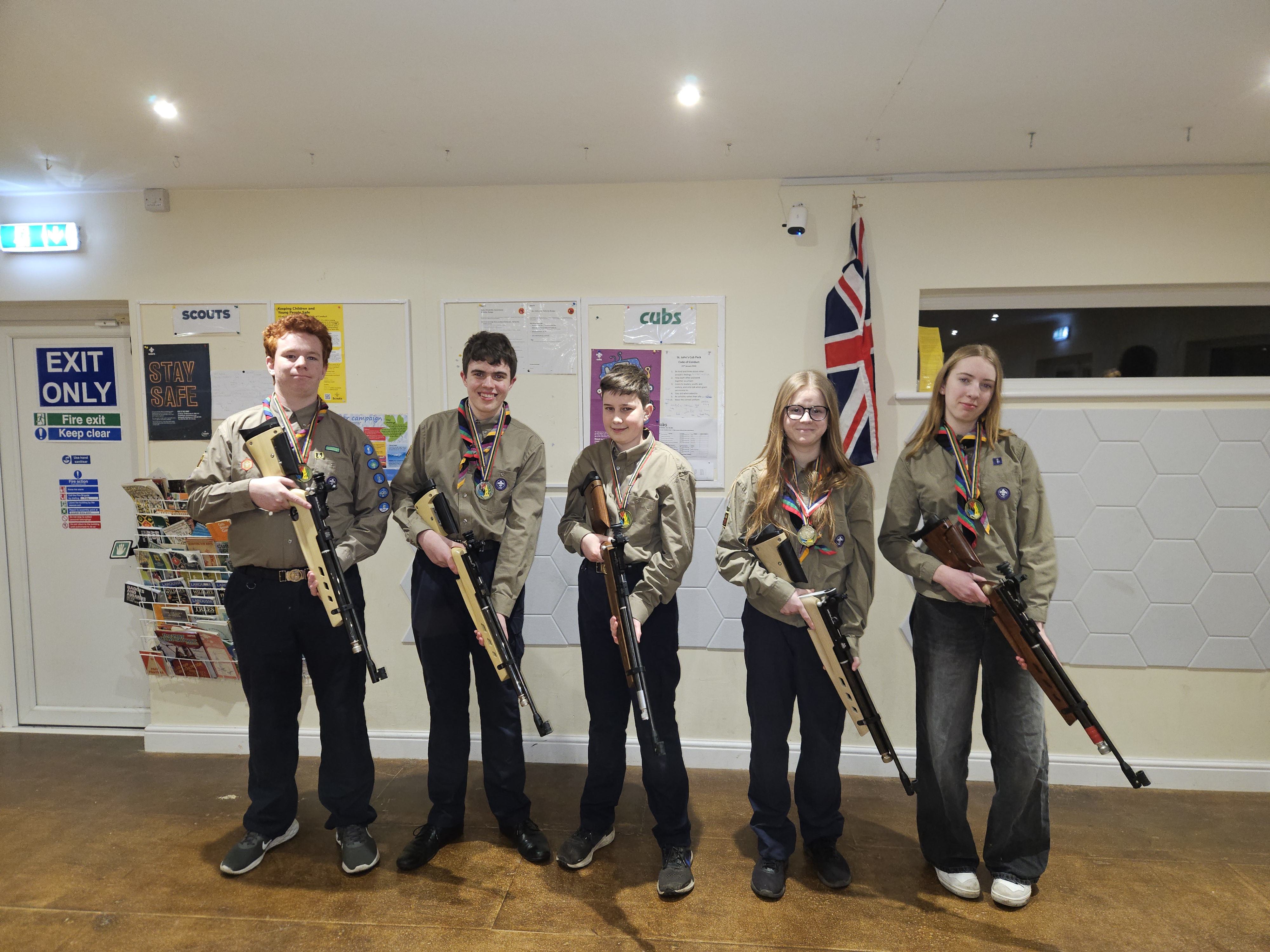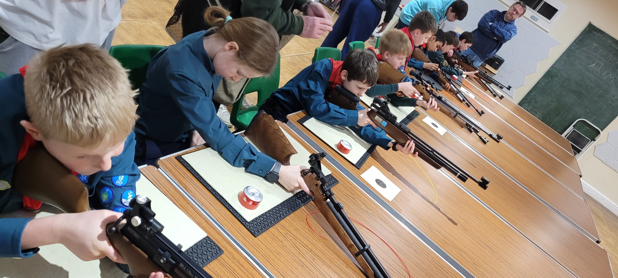 The Shooting Club is held at the Sue Hedges Memorial Hall. We have grown from having four regular members when we first started in 2022 to now having eighteen members, sixteen that shoot regularly. We first started with six shooting lanes, but due to the increase in Scouts and Explorers joining, we have had to introduce an additional two shooting lanes. We shoot a mixture of air rifles, both springer and pre charged pneumatic (pcp), and air pistols at either six yard or ten metres.We also run shooting for the Cubs (aged 8 to 10½) and Scouts (aged 10½ to 14) at Cub/Scouts camp. This gives them an introduction to shooting so that they can get some experience and see if they like doing it. For those that do, we run a Master at Arms course for Scouts. This is a six-week course, where they start shooting with a spring powered air rifle. Once they have mastered the basics, we progress onto pre charged pneumatic air rifles which are much more accurate and are used in the shooting competitions. We also teach them to use air pistols in the final week or two. Once they have shown continued improvement and can demonstrate they can safely handle and use the rifles, we award them their Master at Arms badge. In the year 2025/2026, we have awarded six Master at Arms badges. This is less than previous years and is due to only a few Cubs moving up to Scouts. We have just had a large amount of Cubs move up to Scouts, so we will have a lot more to train shortly. Once they have achieved this, they are welcome to attend the Shooting Club. We have also run shooting sessions for the Hook Girl Guides and Explorers from other Districts.At the Shooting Club we have had some amazing results in both local and County shooting competitions. We have had Scouts enter the District Scout competition as well as both Scouts and Explorers (aged 14 to 18) entering the Hampshire County Shooting competition. They all shot very well with some very good scores. We had two Scouts and three Explorers make it through to the Hampshire Sporter Rifle Final. We are in the process of organising a District Explorers Shooting competition. This will be held in the Hook Scout Hut on the 18th April and is open to all Explorers in the Bramshill District. Unfortunately, the National Shooting competition did not take place at the end of last year due to organisational issues. The Leaders are members of several Home Office approved Shooting Clubs and we are taking the members along to shoot at Bisley on Guest days to give them some live fire experience with both full bore and small bore shooting. We have also entered several Live Fire competitions organised by Surrey County Scout Rifle Club. These are held at the National Shooting Centre in Bisley. We had an Explorer who won and was presented a trophy in the Surrey Coronation Cup competition for 100 yards open sights using a full bore 7.62mm rifle. This is where you use the metal sights on the rifle and are not allowed to use a scope. We also had eight Scouts, Explorers and a couple of Leaders enter the Surrey Match competition. This is a competition shooting several different types of rifles in several different categories. The rifles used are a Ruger .22 bolt action, a Smith and Wesson .22 semi automatic and a Marlin .357 underlever rifle. The categories included a turning target, a limited timed round and a standard shooting round. We did well in the competition and even won a Silver medal. If you are interested in getting involved or want any further information, please speak to one of the Leaders.